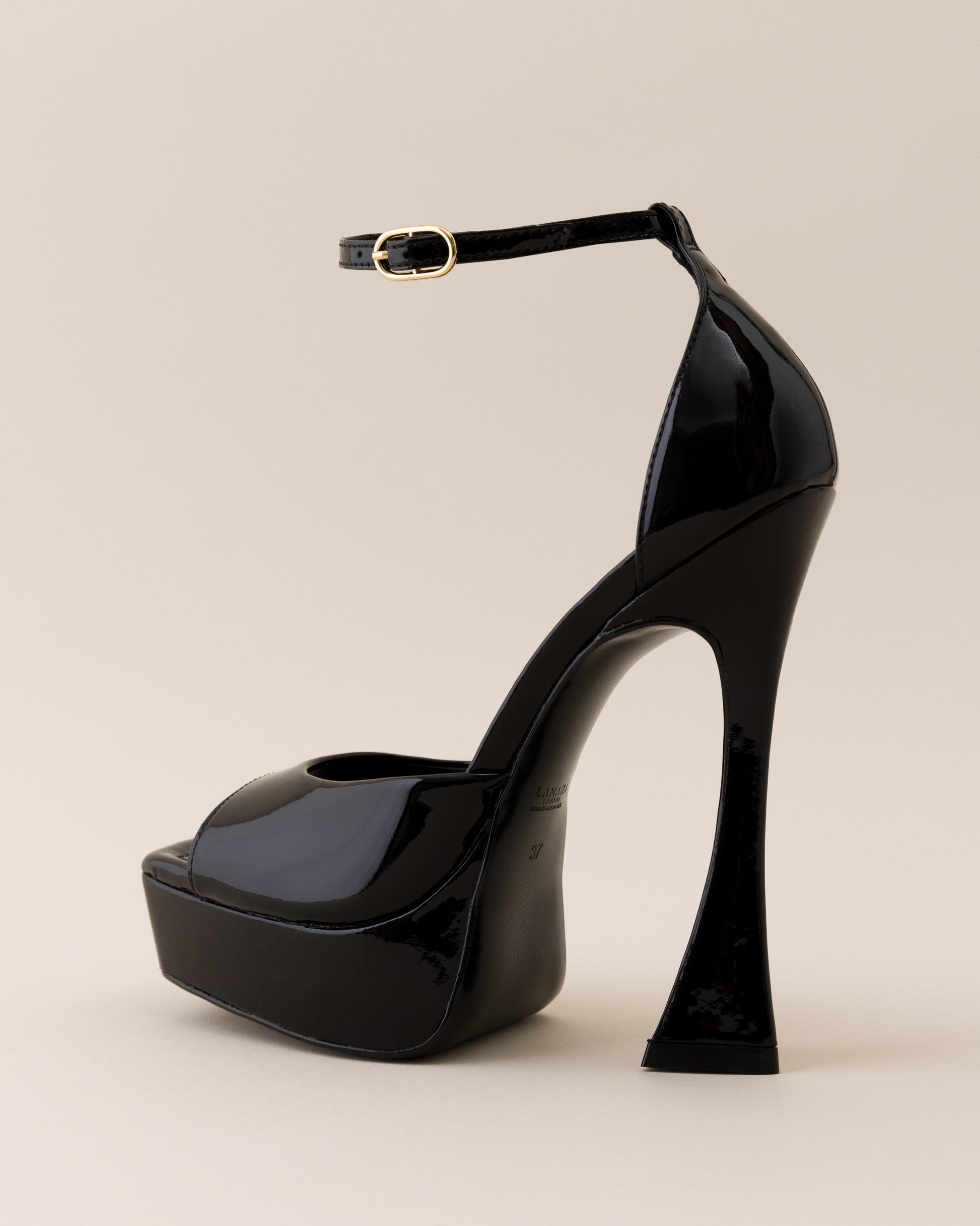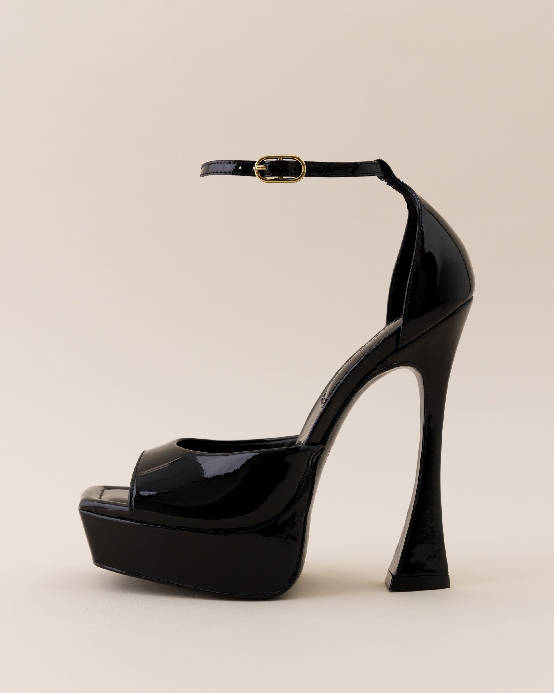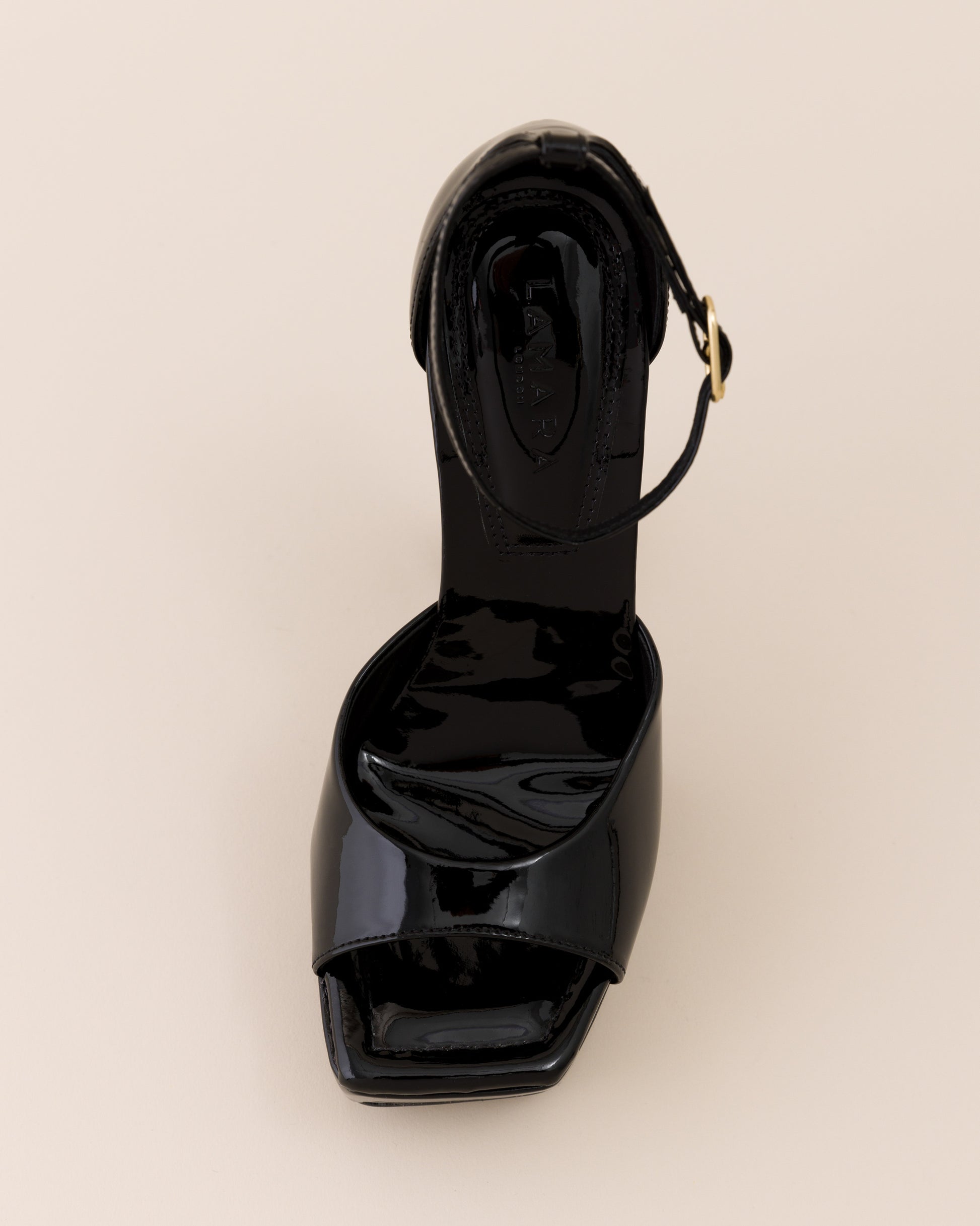 Fly Away is our squared toe best-selling platform made in black patent leather. This style presents a 130mm sculptural heel and 30mm platform (the perceived height is 100mm), both covered in matching black patent leather. Handmade in Brazil.