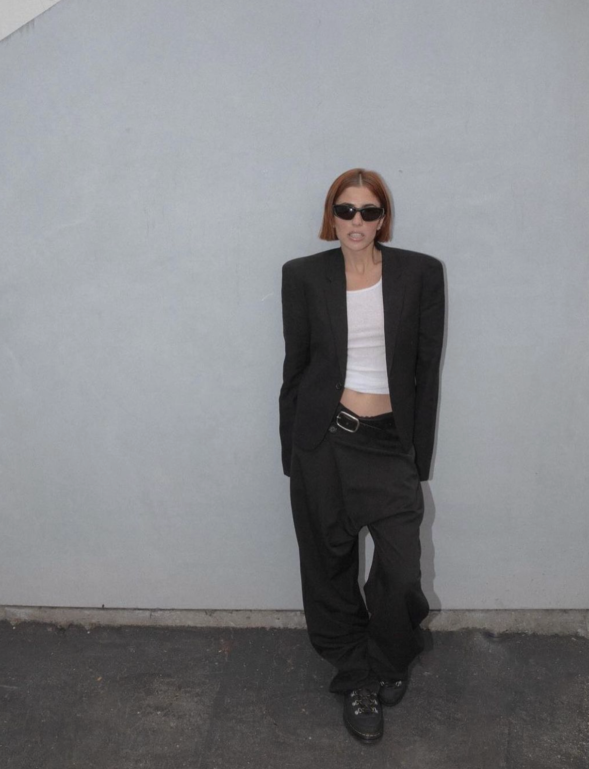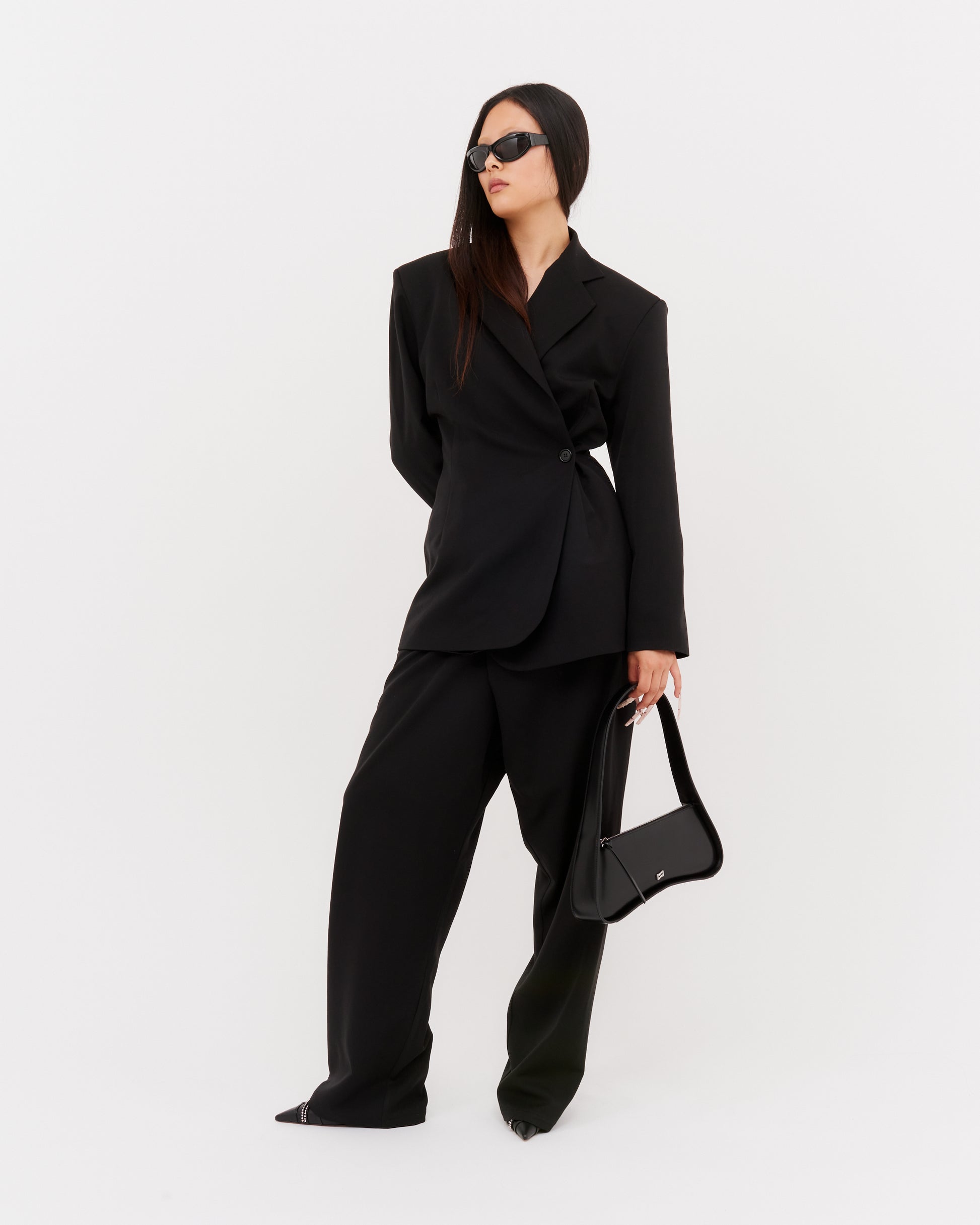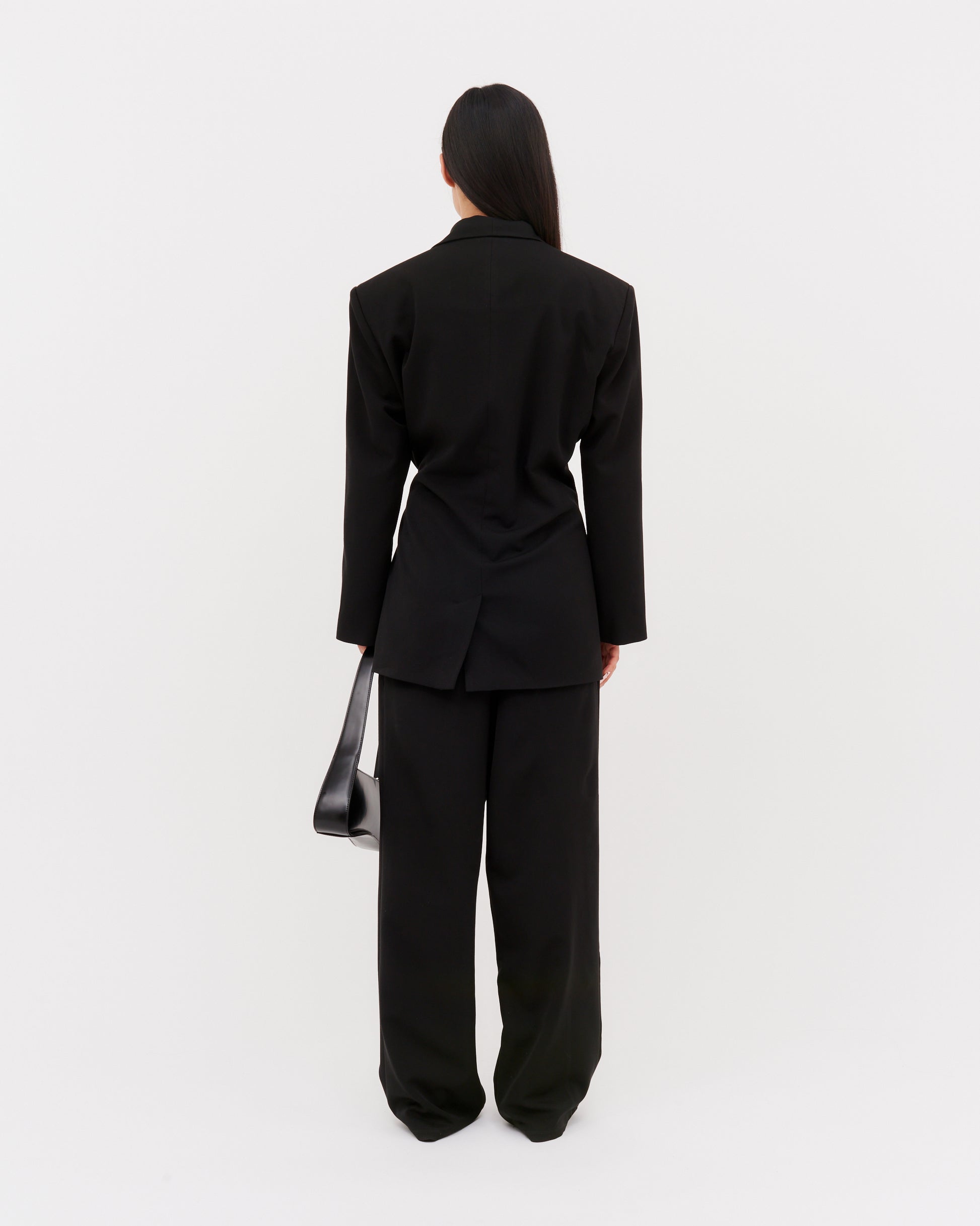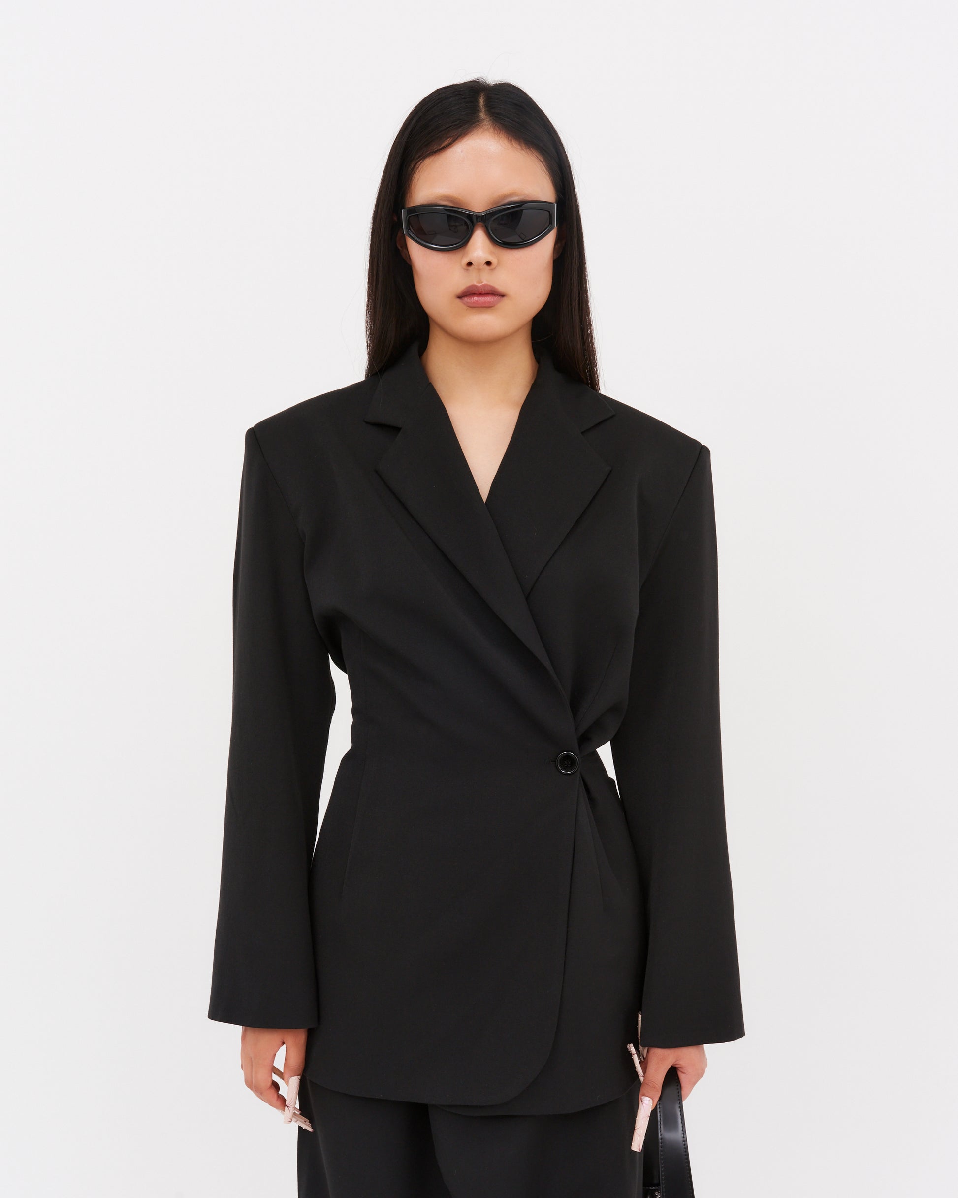 Introducing our power suit ROCCA - a timeless classic that combines sophistication and structured style. The jacket button placement elevates this jacket with a waist-enhancing design. This tailored construction creates an hourglass silhouette, emphasising curves and adding a touch of femininity. Complete with shoulder pads.