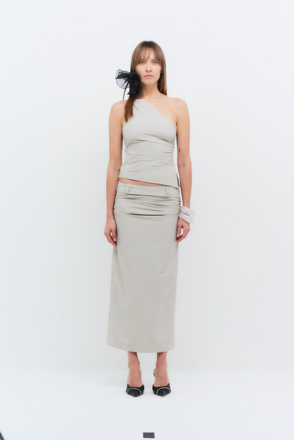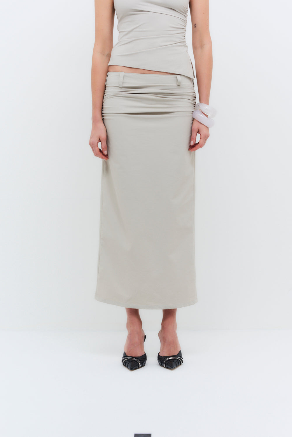 Designed as the perfect complement to the Rhea top, this skirt features super stretchy fabric and hip ruche detailing to flatter any body shape. Its versatile design makes it a stylish choice for any occasion, effortlessly transitioning from day to night.