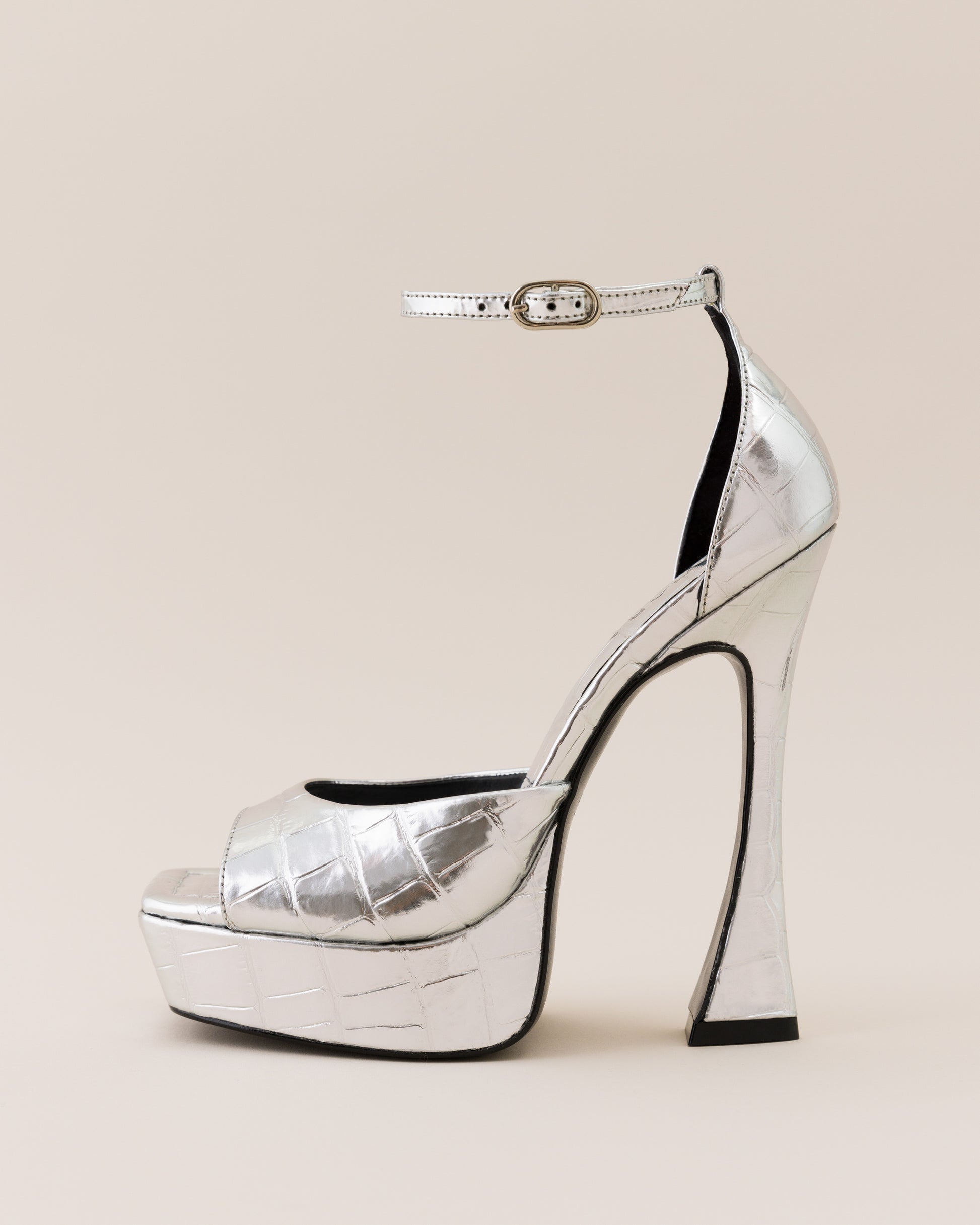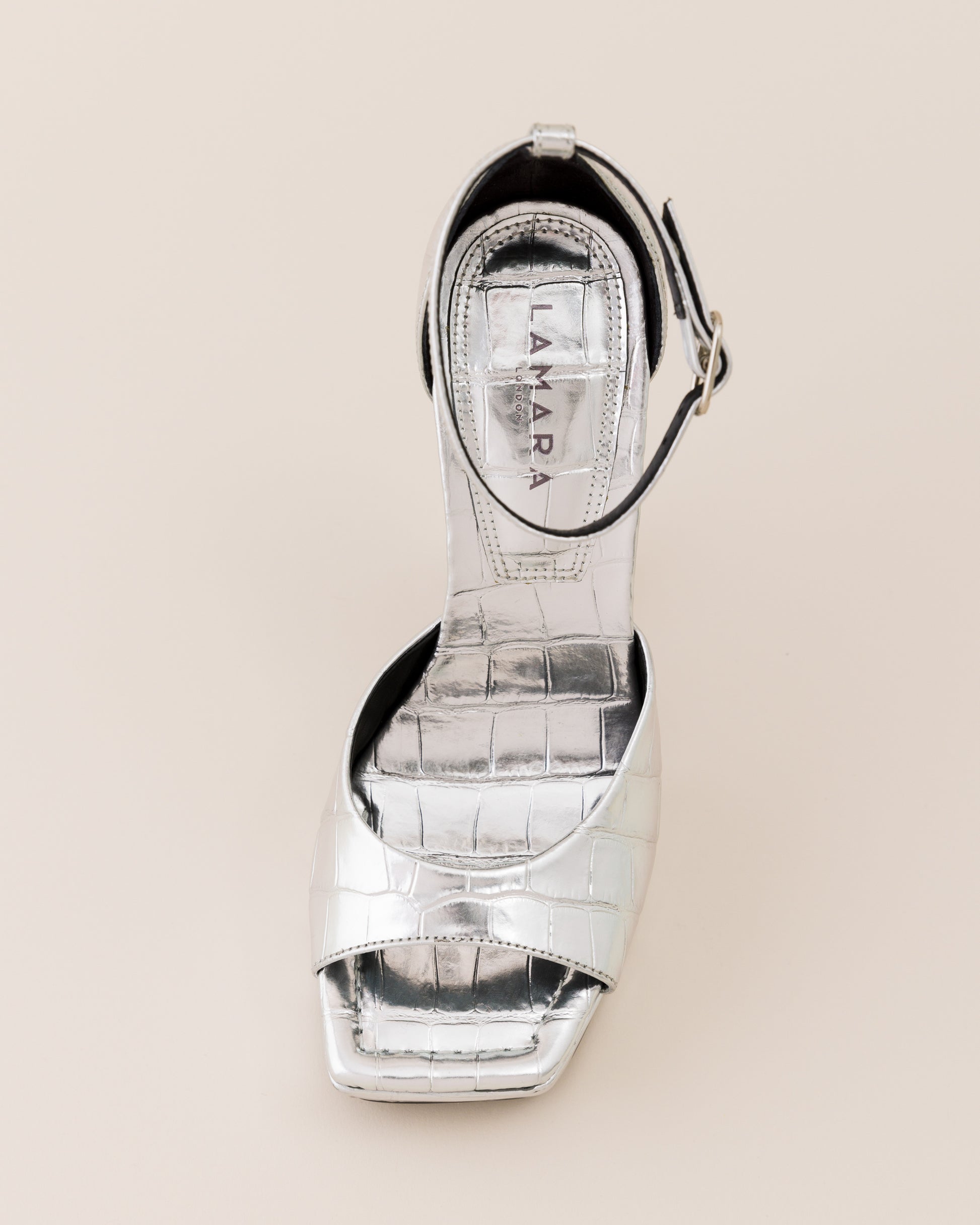 Fly Away is our squared toe best-selling platform made in silver croc leather. This style presents a 130mm sculptural heel and 30mm platform (the perceived height is 100mm), both covered in matching silver croc leather. Handmade in Brazil.