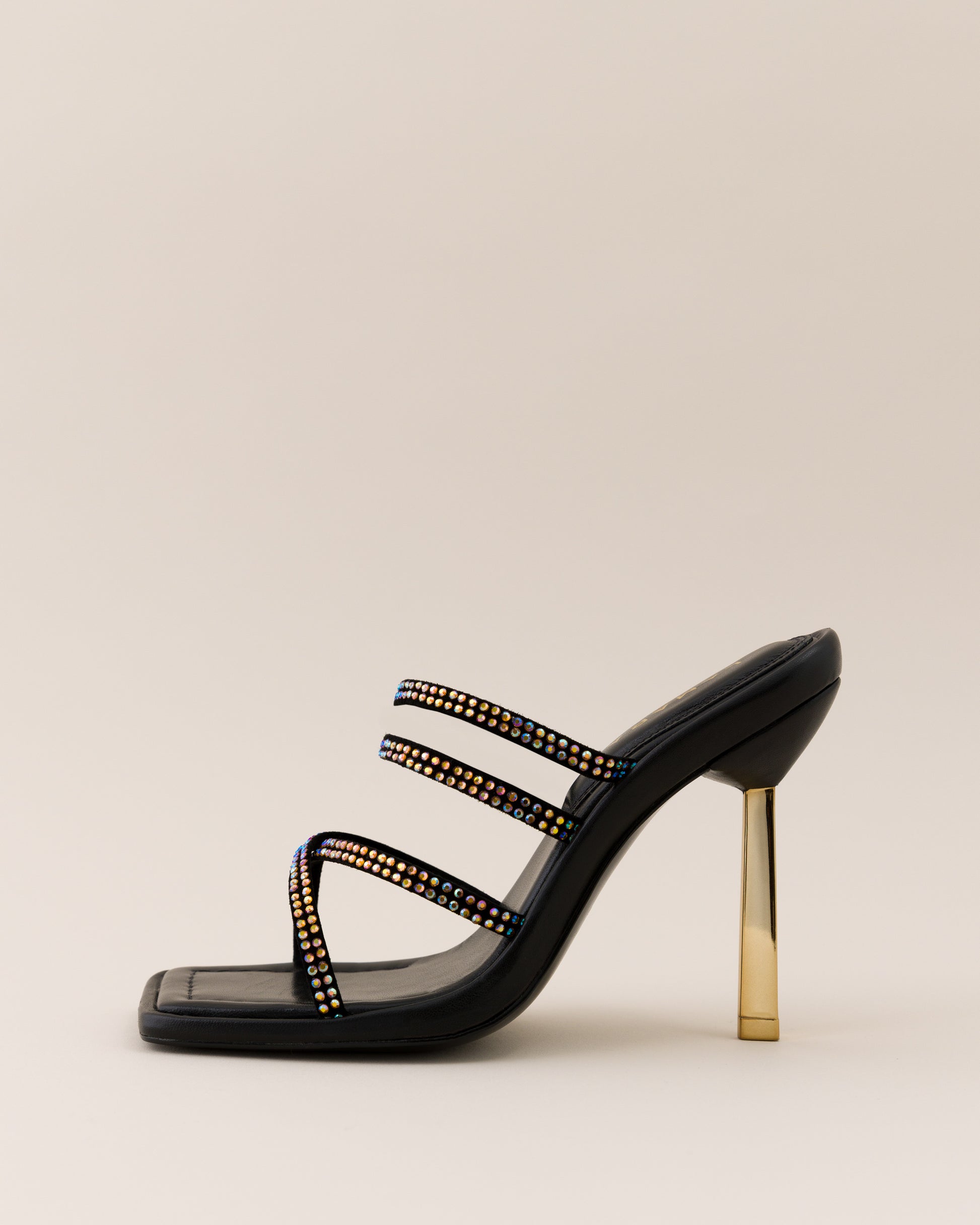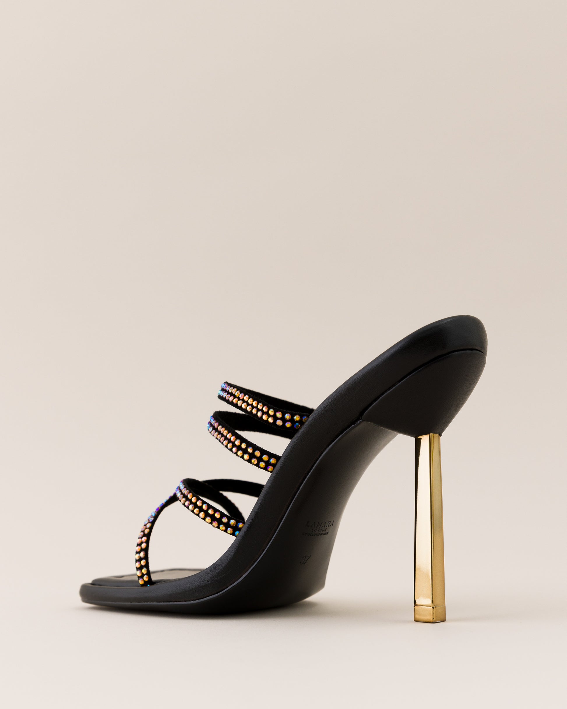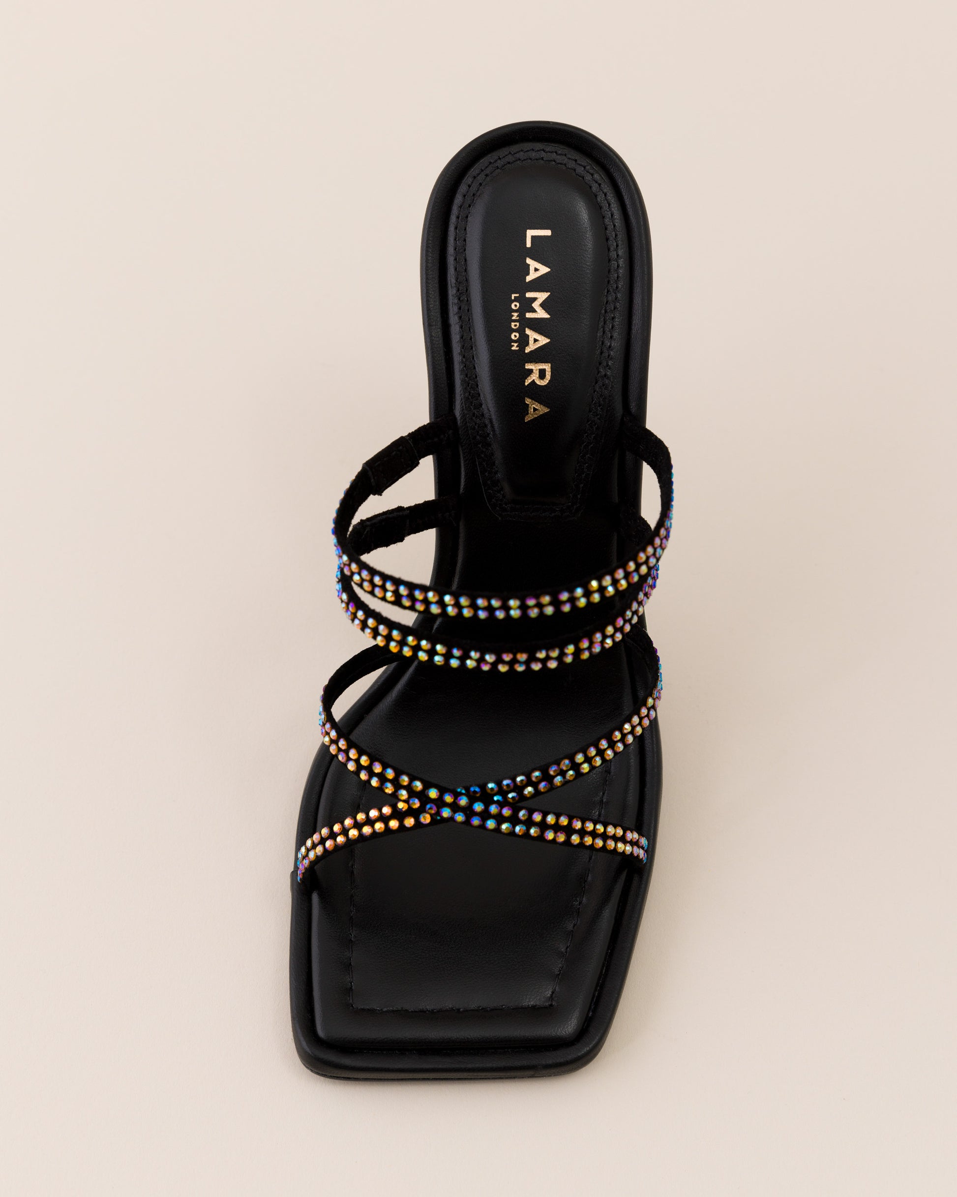 Quintessence of female glamour, Conduit St is a multi-strap squared-toe mule. A simple, original design is finely embellished with ombre tiny crystals. For easy wearability, this style comes with two separate tie lengths which you can use to make this mule into a tie up sandal. Handmade in Brazil.