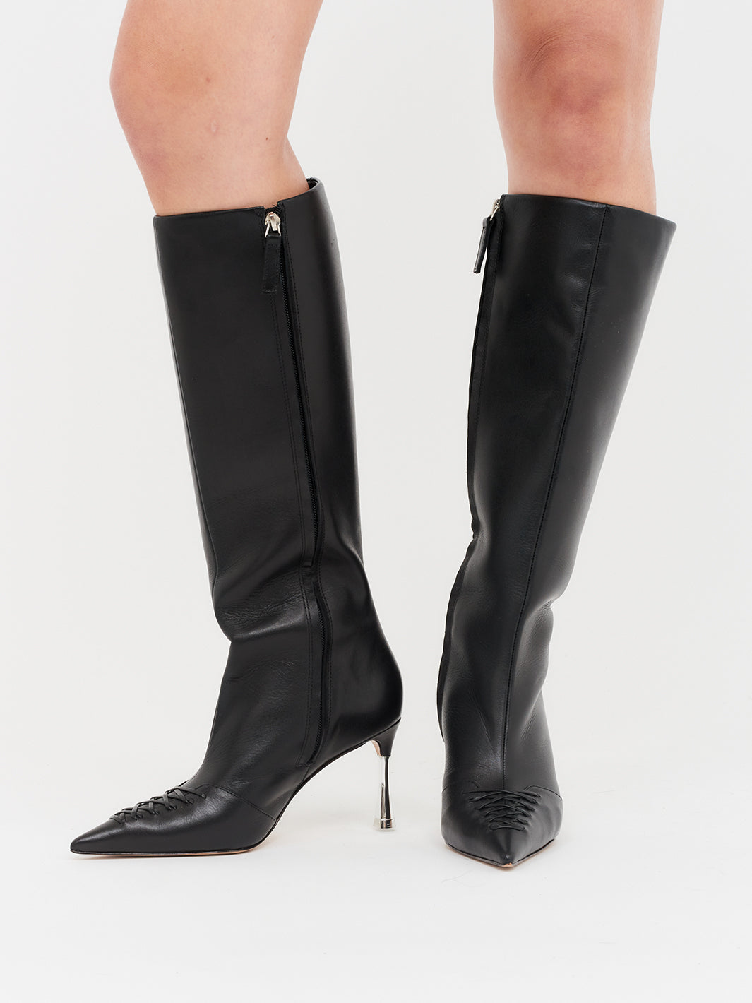 Our Kiara boot is an iconic footwear piece that is a symbol of elegance and versatility. The snake embossed leather is accompanied by an interlacing feature detailing over the toe box.