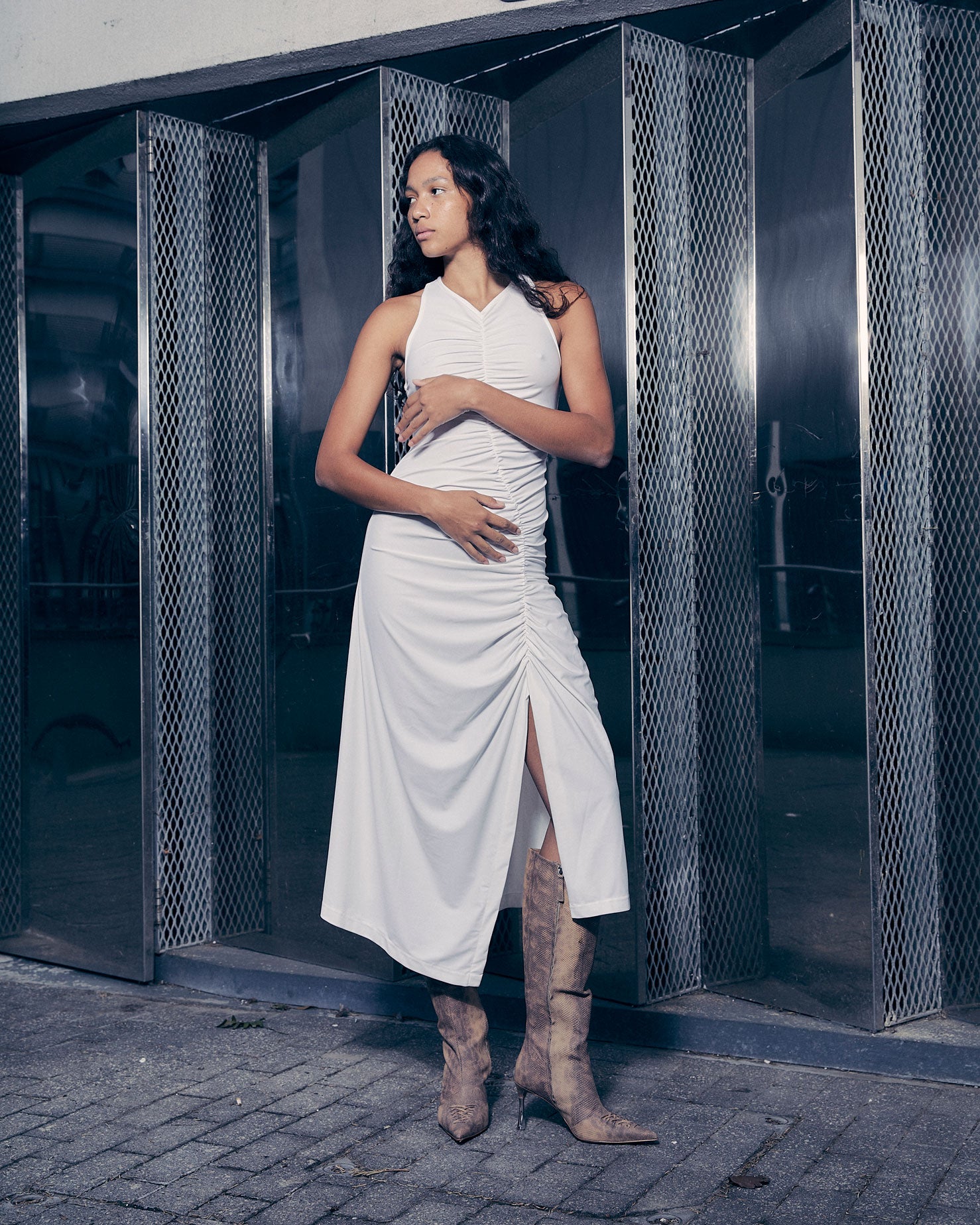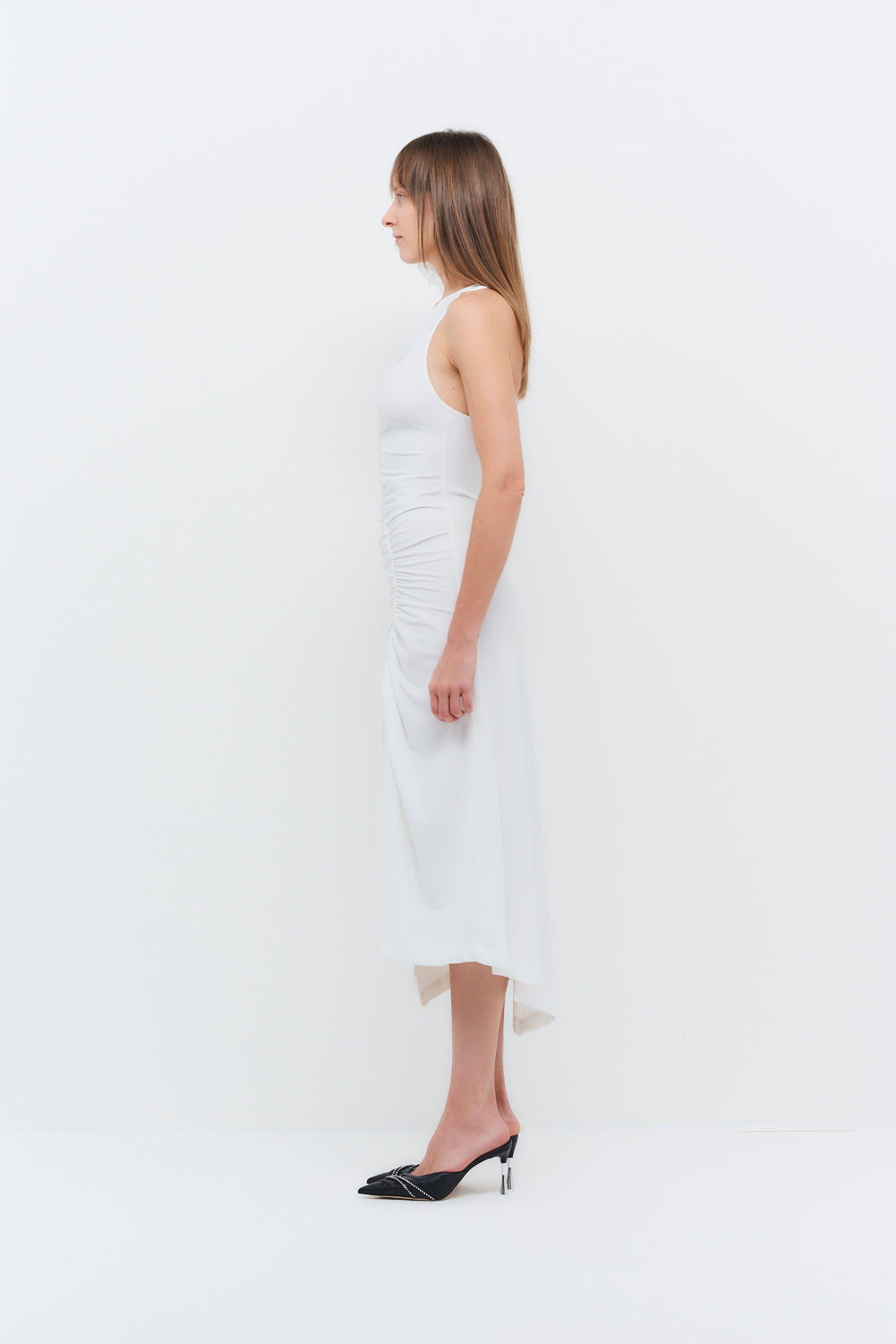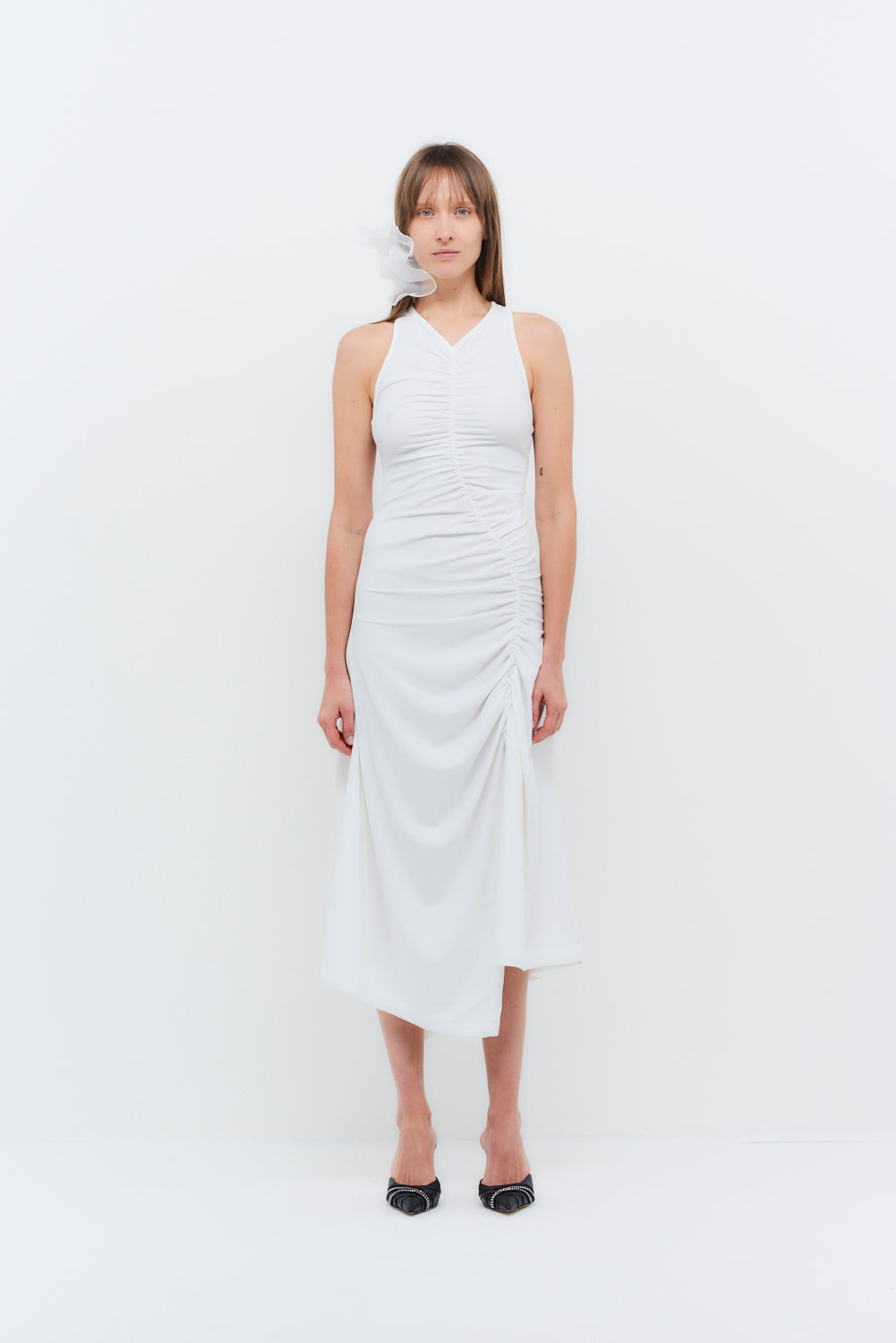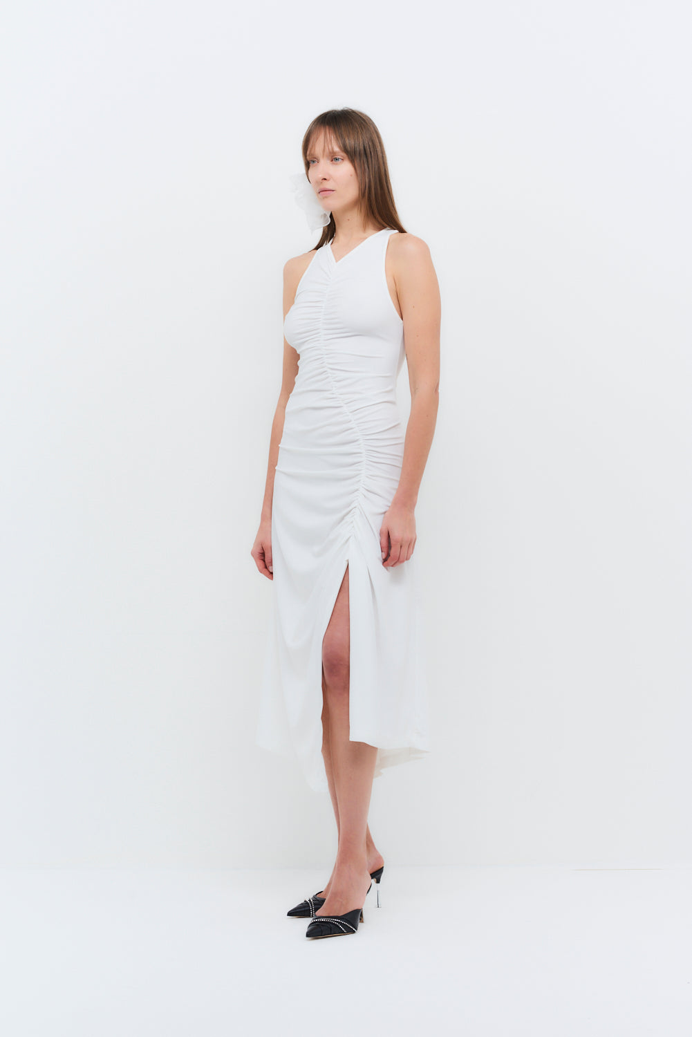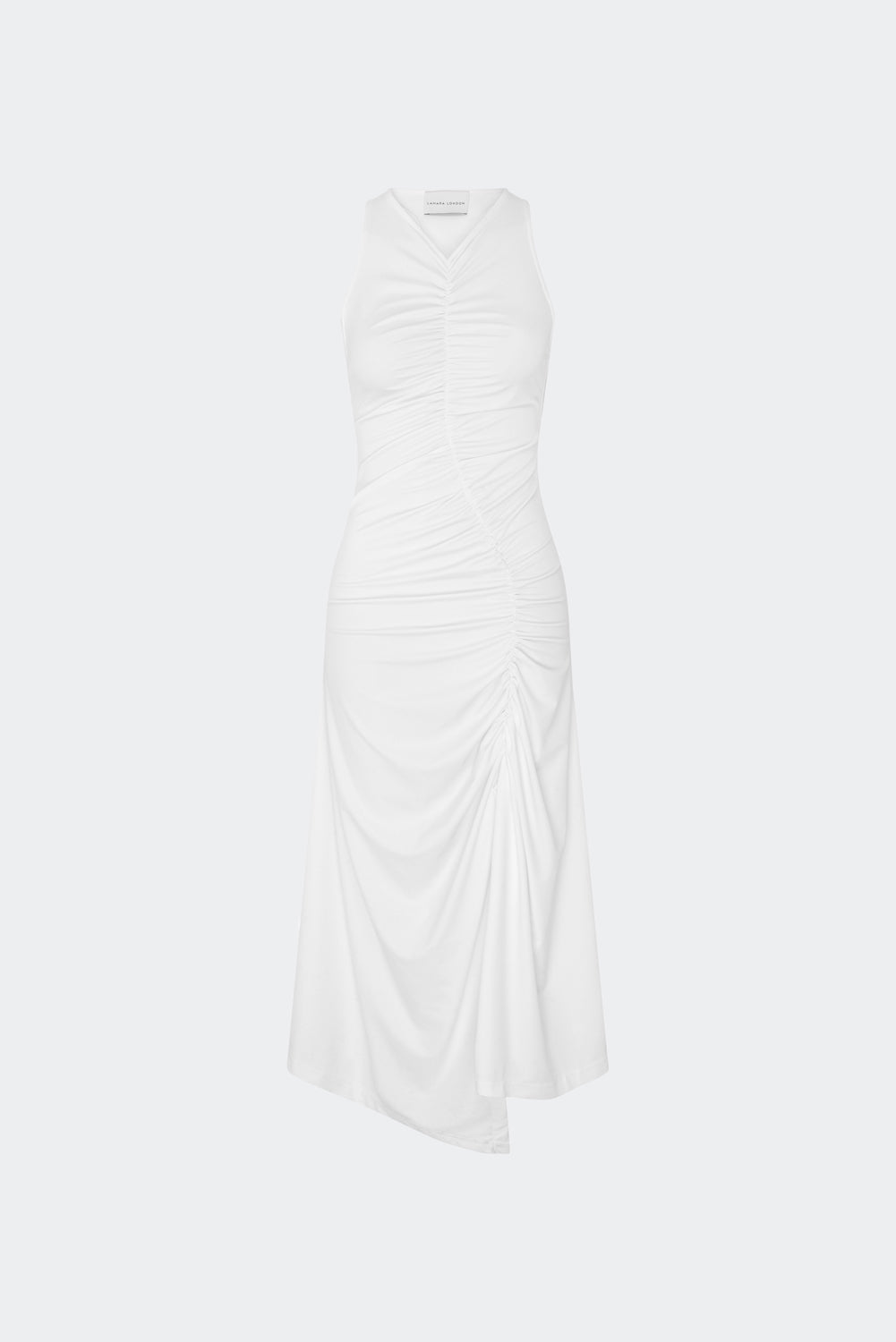 The Philo midi tank dress is a modern fashion statement with a timeless twist. Featuring exquisite asymmetrical ruching down the centre, its silhouette effortlessly enhances your figure, making it a striking choice for any occasion.